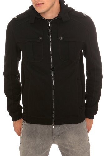 This black knit jacket features front button pockets, a front zip closure, two hip pockets and a detachable hood.